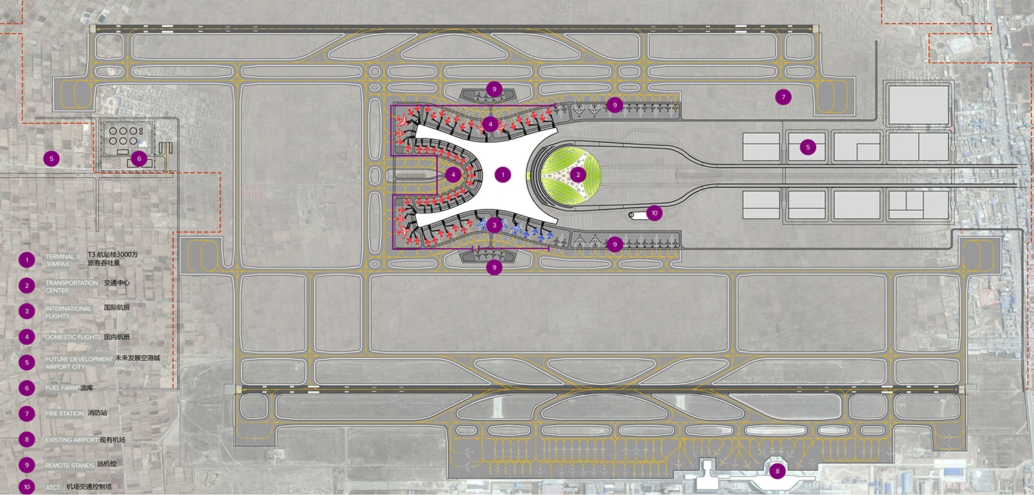 1PAX un plan director integrado que abarcaba las plazas de estacionamiento en zona de operaciones, las pistas de rodaje de la plataforma, las instalaciones de carga y transporte de mercancías, la configuración de las pistas y la ubicación de la torre de control del tráfico aéreo. Se prestó la misma atención a la accesibilidad desde la zona pública, los flujos de pasajeros y una estrategia inmobiliaria a largo plazo destinada a impulsar el desarrollo no aeronáutico.