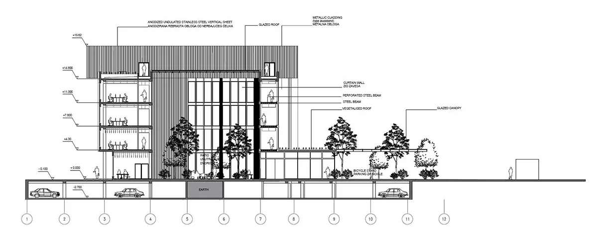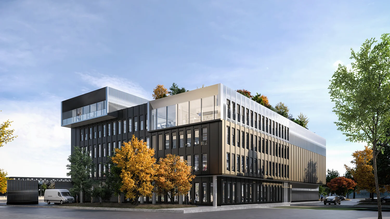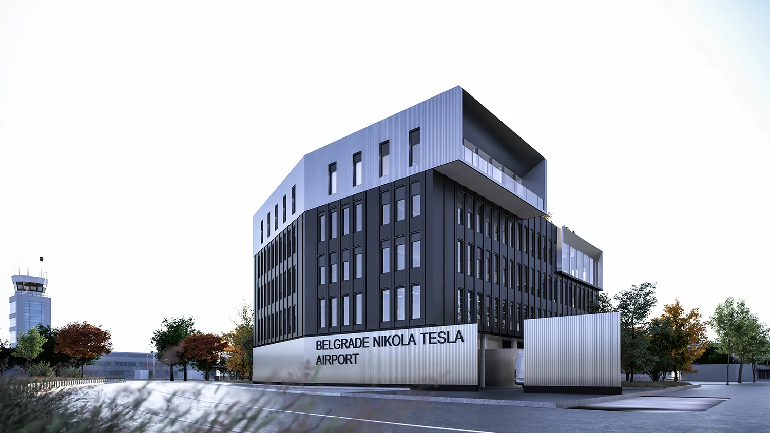 In 2019, 1PAX was commissioned by Vinci Airports Serbia / Belgrade Airport to design the New Airport Administration Building (NAAB). The project comprises a five-story office building with a basement level, accommodating administrative offices and support services for airport staff. Conceived as a contemporary workplace within the airport campus, the building is organized around a landscaped courtyard that defines its main pedestrian and parking entrances.