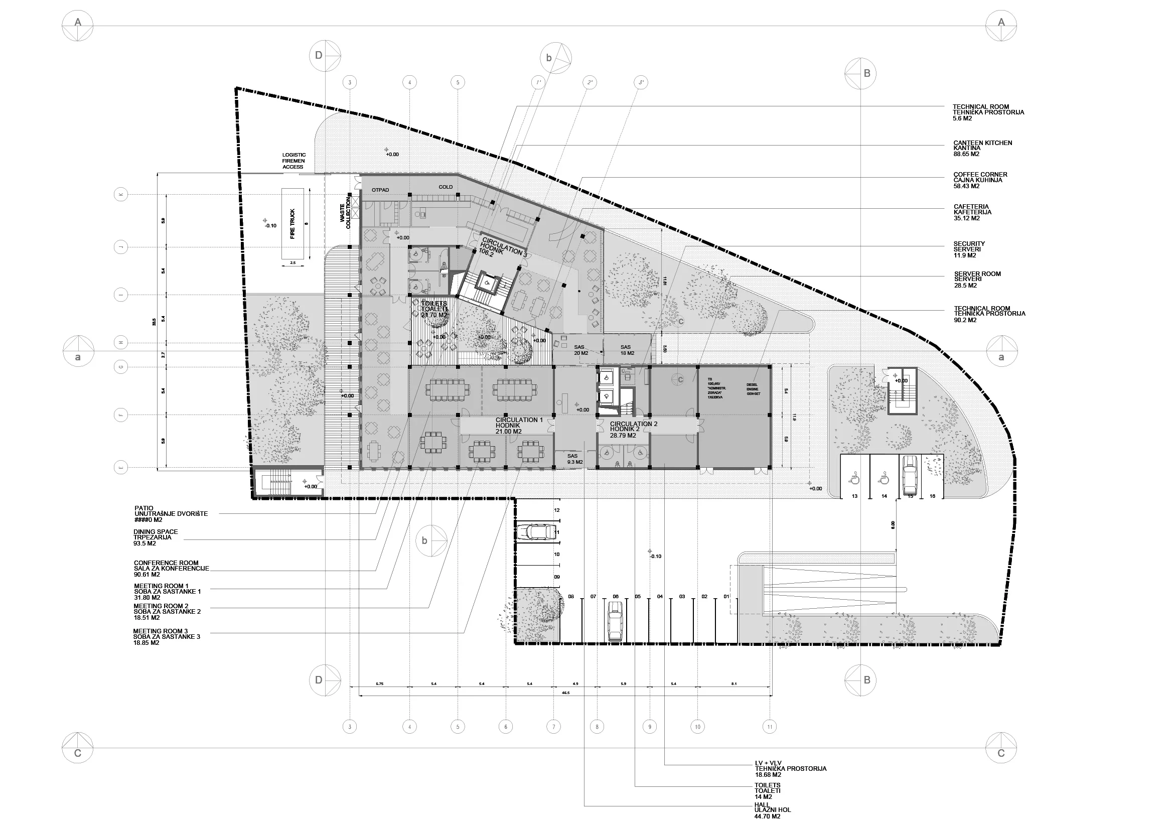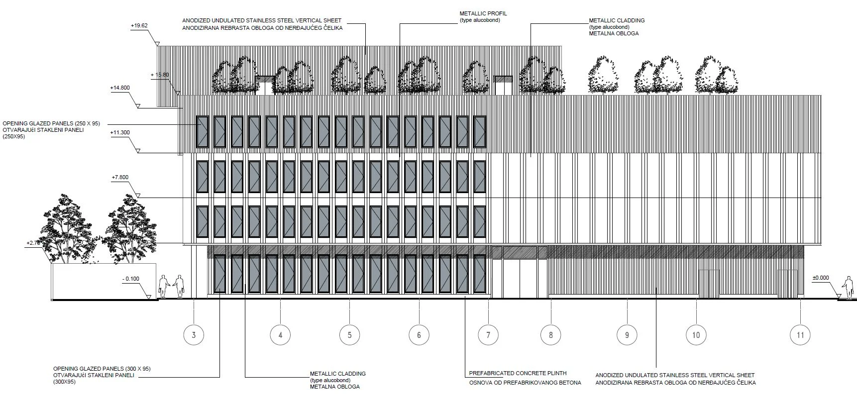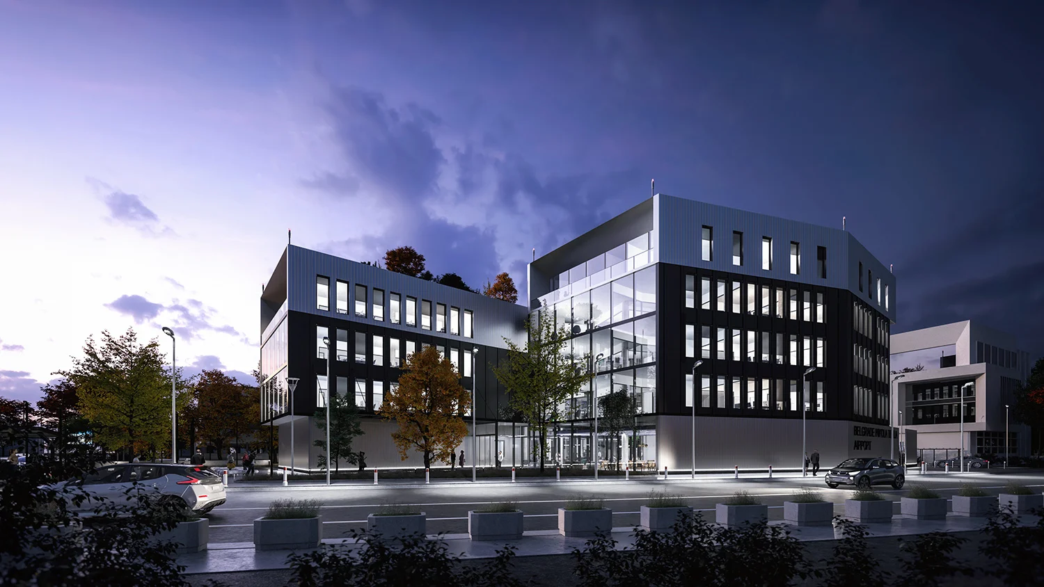 In 2019, 1PAX was commissioned by Vinci Airports Serbia / Belgrade Airport to design the New Airport Administration Building (NAAB). The project comprises a five-story office building with a basement level, accommodating administrative offices and support services for airport staff. Conceived as a contemporary workplace within the airport campus, the building is organized around a landscaped courtyard that defines its main pedestrian and parking entrances.