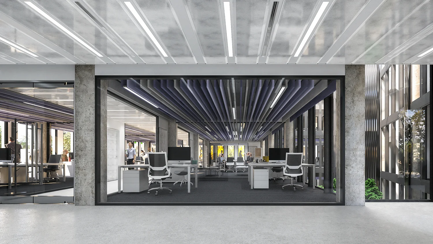 1PAX developed a design strategy centered on natural light, greenery, and passive environmental control. Office layouts were carefully oriented to maximize daylight while minimizing glare and overheating, supported by sunshades and external blinds protecting the glazed façades. A planted roof was introduced to reduce thermal gain and improve overall environmental performance.