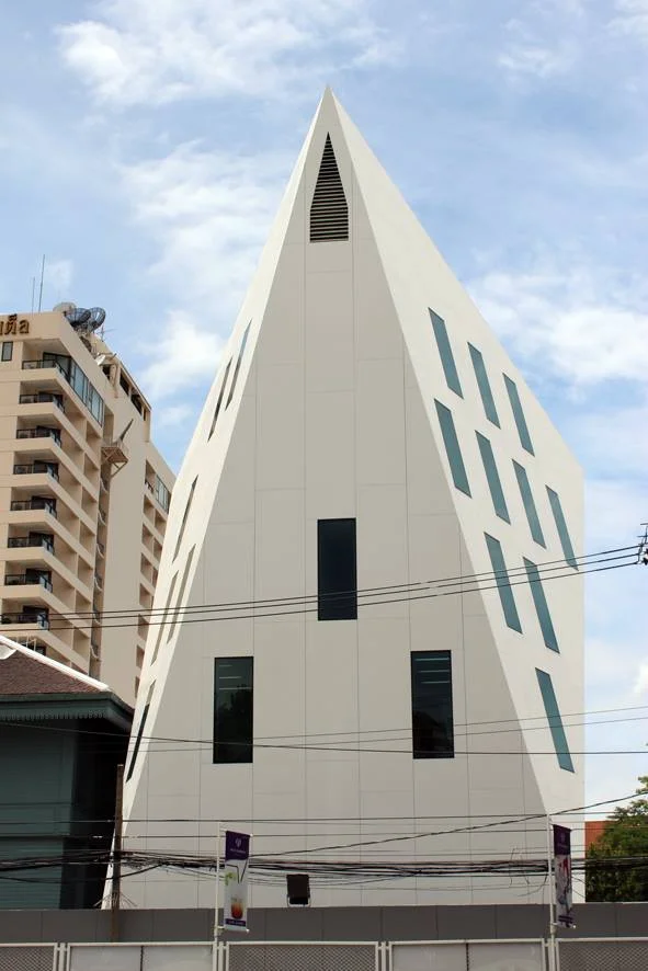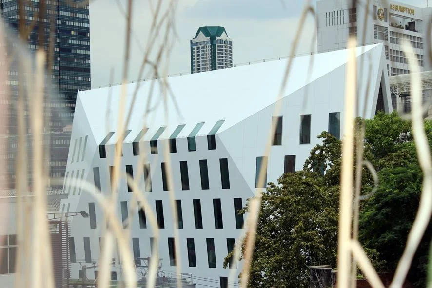 The design proposed a radical yet respectful architectural language: a white building characterized by sharp, sloping forms inspired by Thai vernacular architecture. This contemporary interpretation established a strong identity while maintaining dialogue with local climatic and cultural references. The intervention combined the renovation of an existing building with the construction of a new extension, creating a cohesive ensemble that balanced modernity, tradition, and sustainability. This approach demonstrated how adaptive reuse and extension could deliver architectural ambition without resorting to total reconstruction.