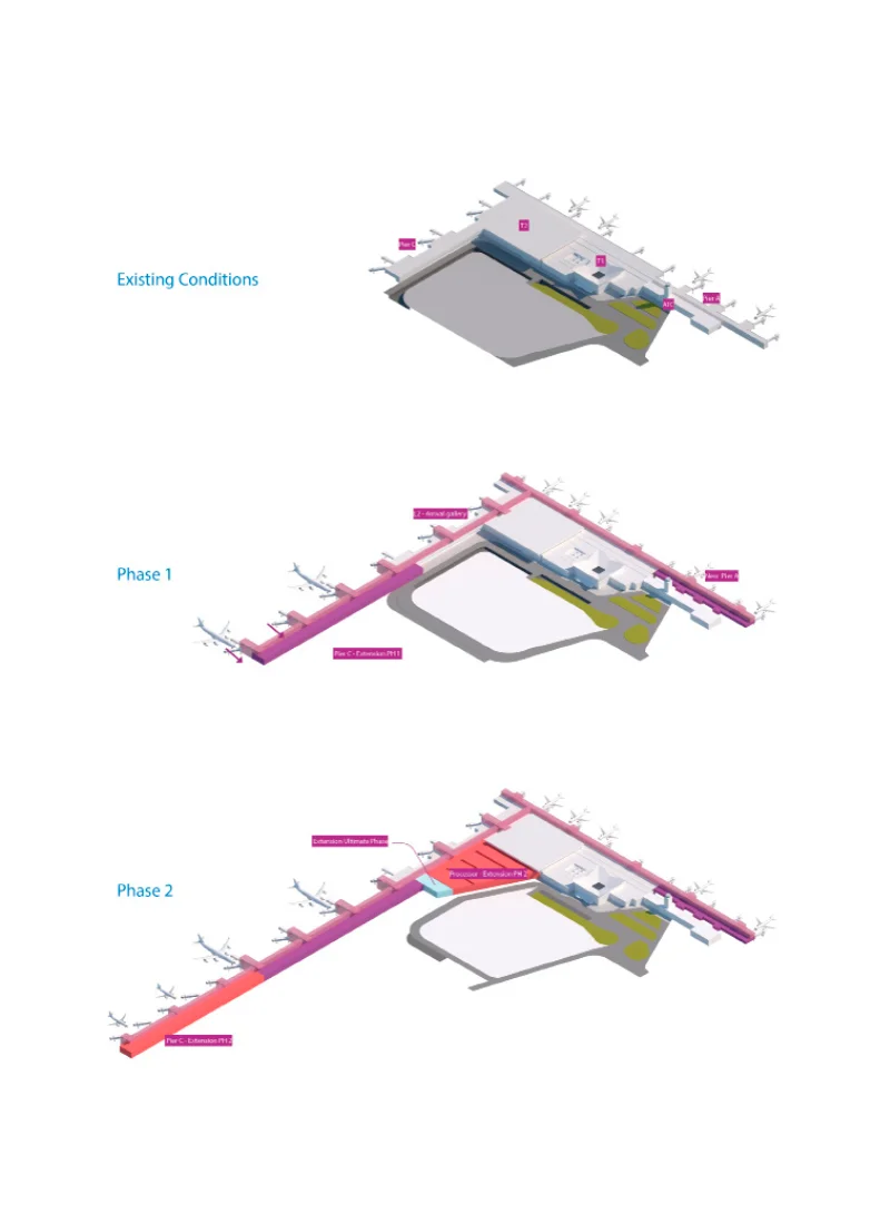 Phase 1 focuses on immediate capacity and flow improvements, including the addition of an arrivals gallery on the roof of the existing terminal, the construction of a new boarding pier with three MARS contact stands, and an interior refurbishment introducing a new centralized security screening area to streamline passenger processing.