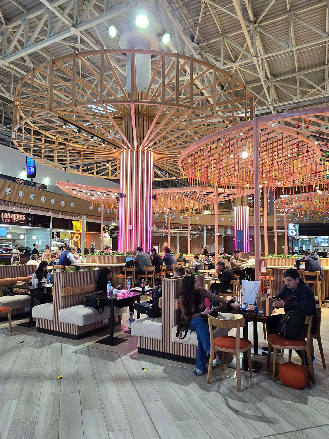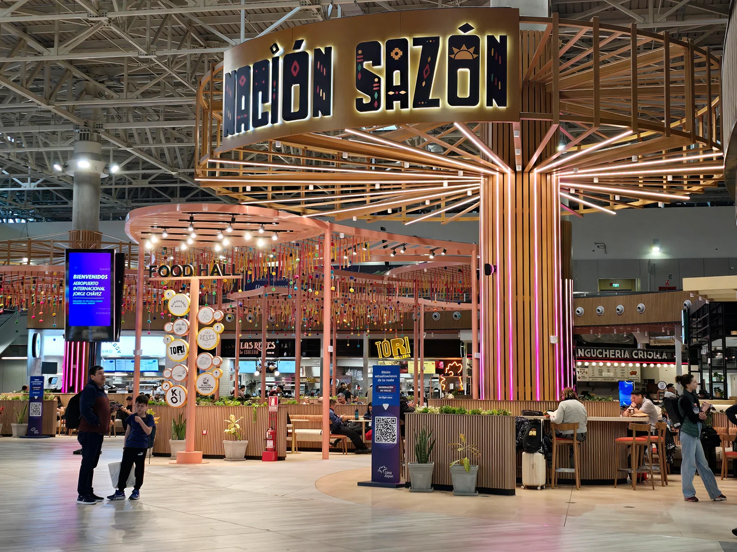 A 1PAX concebeu o Food Hall como um espaço panorâmico e claramente estruturado, organizado em cinco zonas distintas. A entrada é dominada pelo Sazón Nation, um marco espacial marcante definido por elementos esculturais semelhantes a árvores que estabelecem a identidade e a visibilidade desde o início. A partir deste ponto, os passageiros beneficiam de linhas de visão claras sobre todos os quiosques, dispostos de forma a apresentar uma oferta culinária diversificada e apoiados por sinalização direcional clara.
