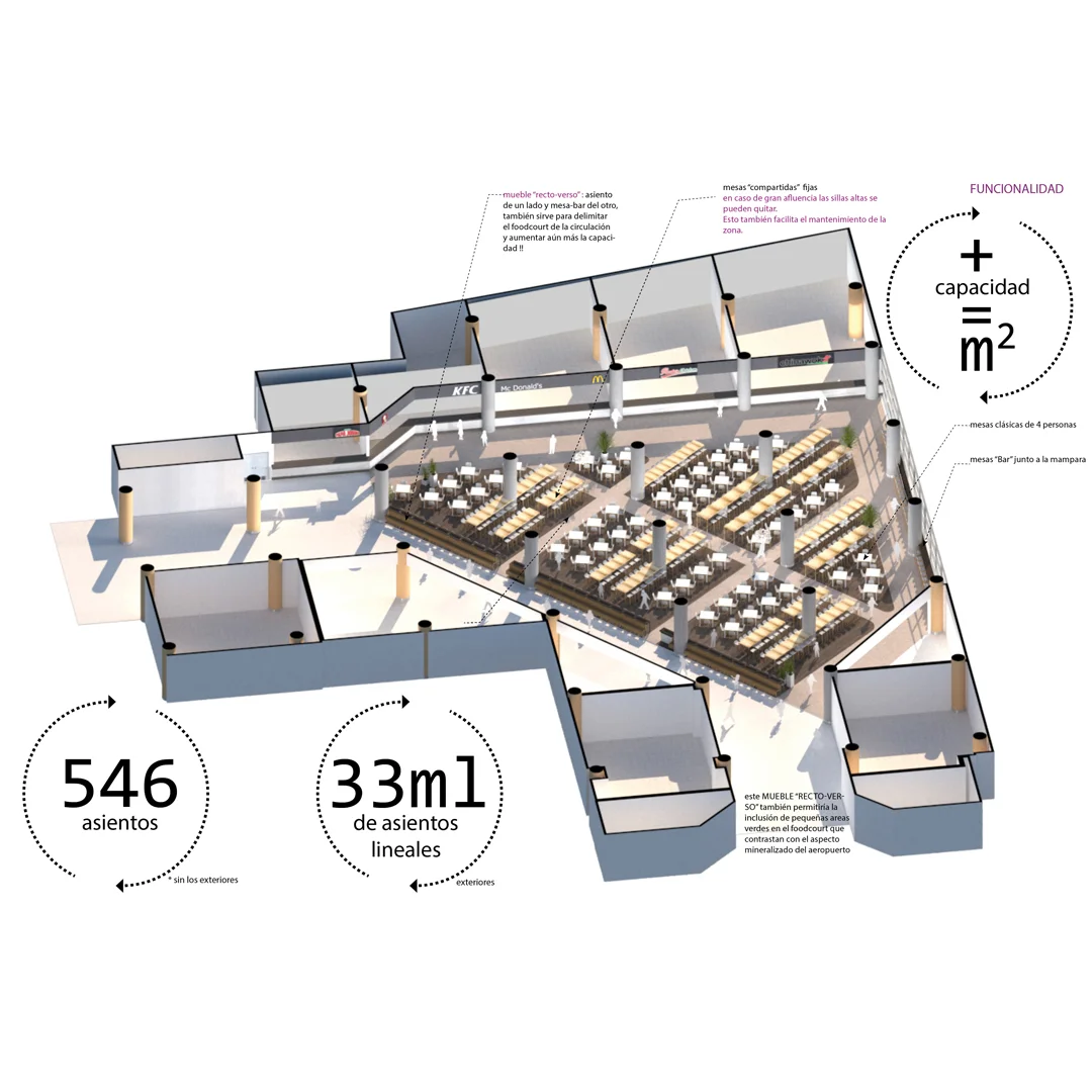 Postojeći sud za hranu više nije bio u stanju da zadovolji maksimalnu potražnju u pogledu kapaciteta, udobnosti i prostorne jasnoće. Izazov je bio da se značajno poveća broj sedišta i poboljšaju ukupne performanse - akustično, osvetljenje i prostorna organizacija - istovremeno obezbeđujući jednostavnost održavanja i operativnu efikasnost za operatera aerodroma, a sve u ograničenom okruženju na kopnu.
