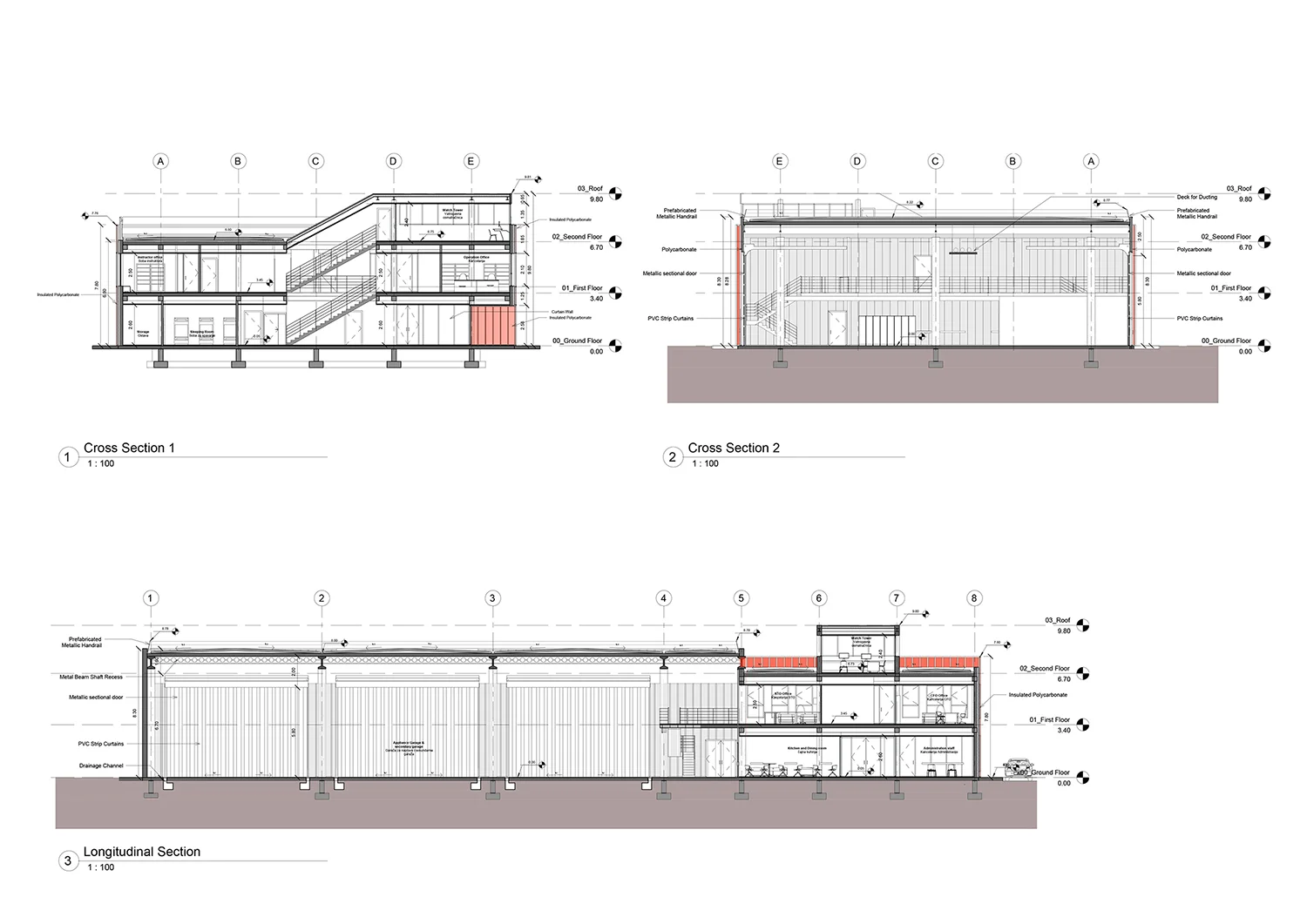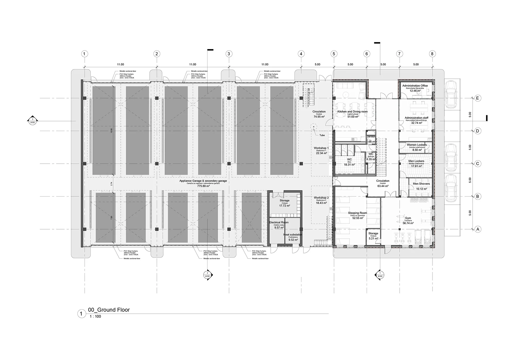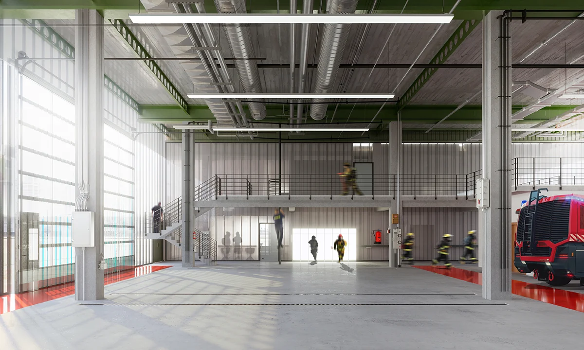 经过精心设计的内部连接通道将两个区域连接起来,同时保持其相互隔离,从而既确保了功能效率,又实现了环境控制。流通路径和空间布局的规划旨在最大限度地缩短响应时间,使消防员能够迅速从休息区或工作区移动到行动位置。